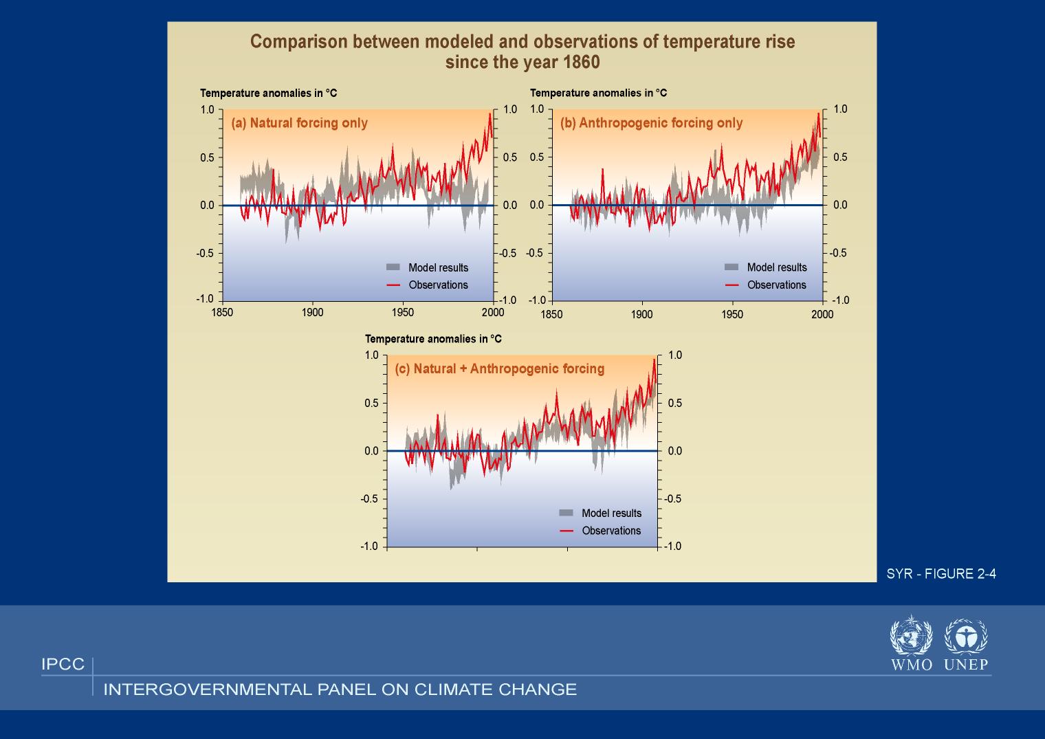 The comparison shows models with natural, anthropogenic, and combined forcing for 1860--2000.