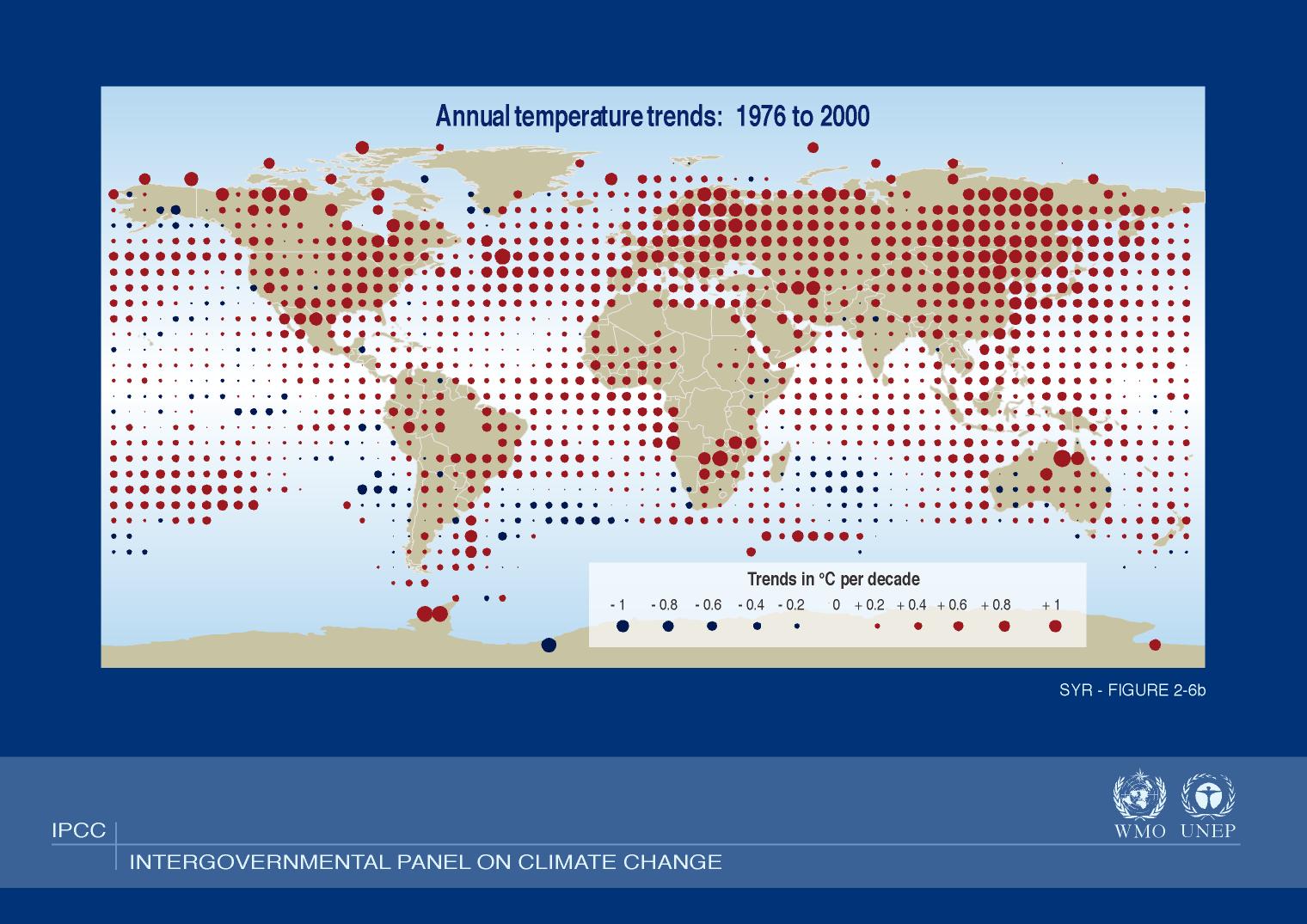 The dots indicate the increase in annual temperature per decade averaged over the period 1976--2000.