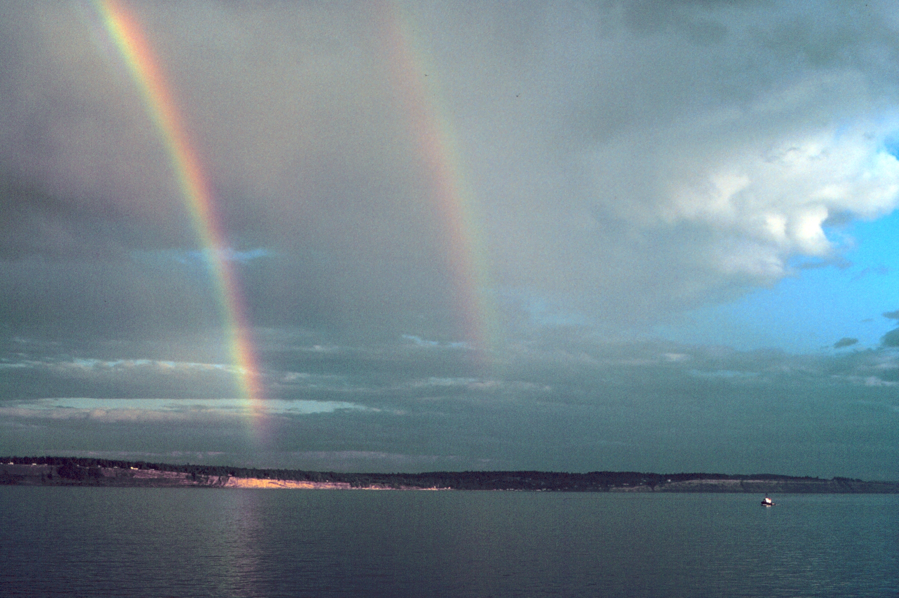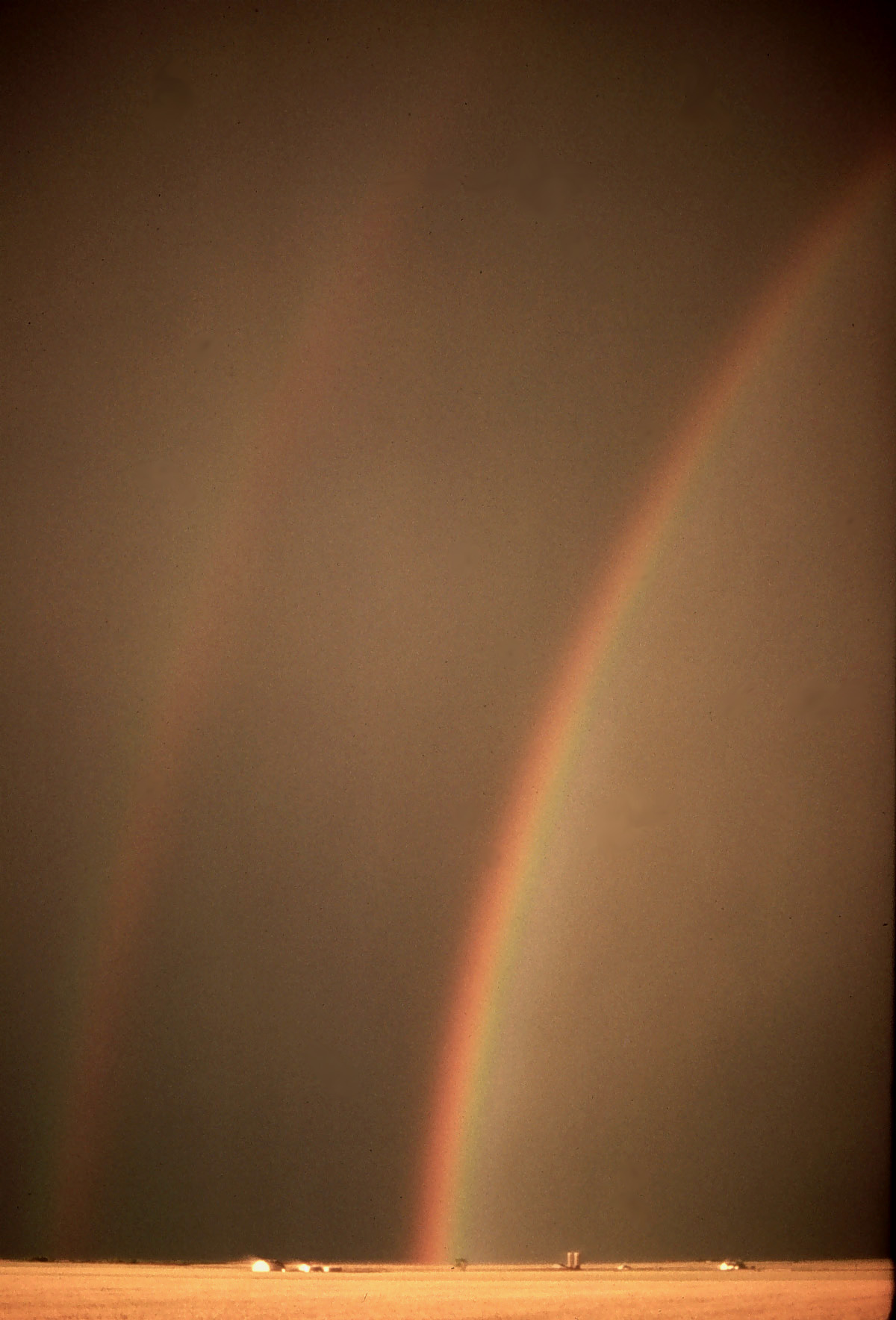 A rainbow over Oklahoma. It's hard to see the secondary rainbow.