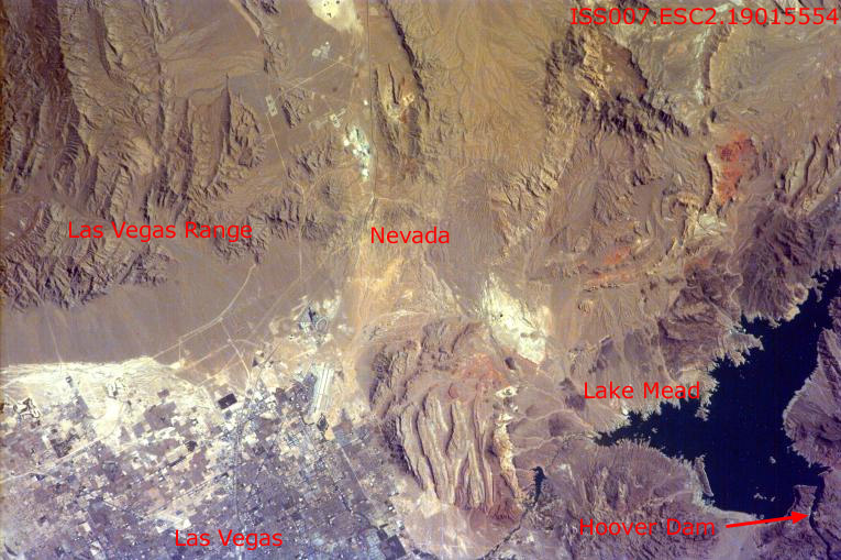 North is to the upper left. The Las Vegas Wash pours into the leftmost corner of Lake Mead. The Highway 95 to the north-west is clear. The I-15 is probably the curve that streaks from the word Las Vegas up to the right and then more or less to the top middle. UNLV is probably off the picture south of the word Las Vegas.