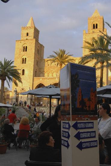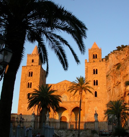 The photo is from the evening and shows the square before the Cathedral which faces west. Construction was started in the 1140's. It is Norman with Byzantine style mosaics inside with influences from Arabic world and elsewhere.