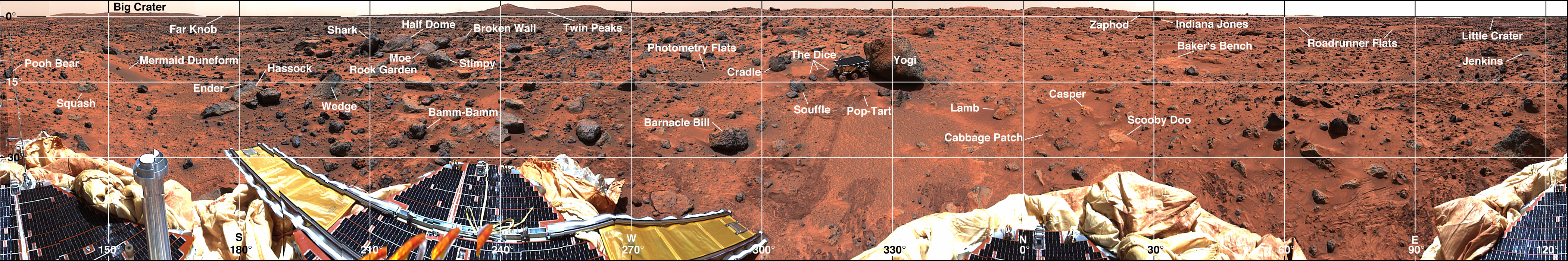 In order to study the surroundings in detail with the SOJOURNER ROVER (near Yogi at 320 degrees in the image), it was necessary to map the landscape.