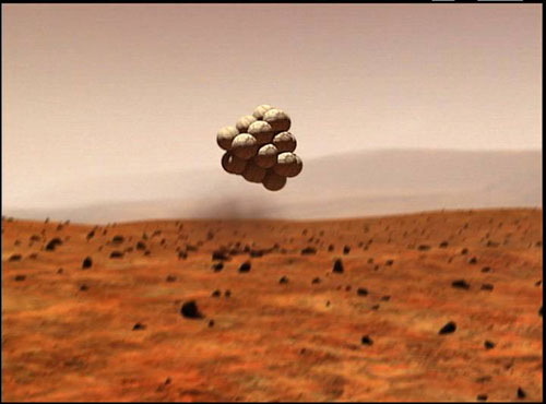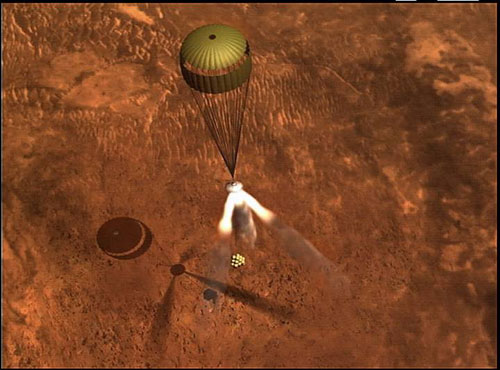 Artist conceptions of how the Mars Exploration Rovers of 2004 (Spirit and Opportunity) landed.