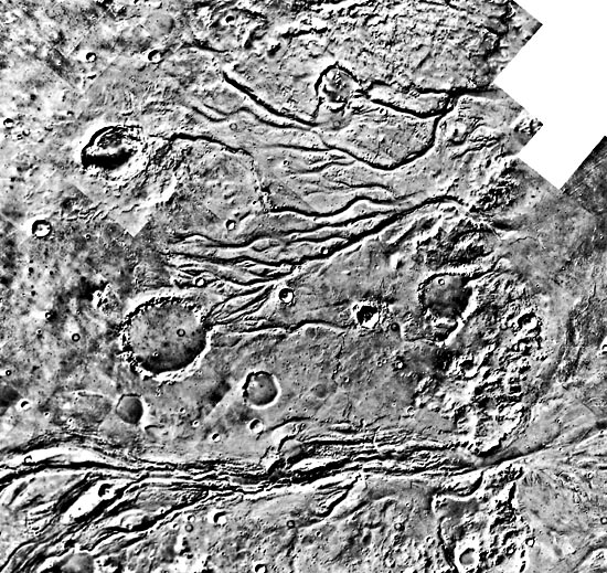 Some impact craters, channels, and dark regions can also be seen.