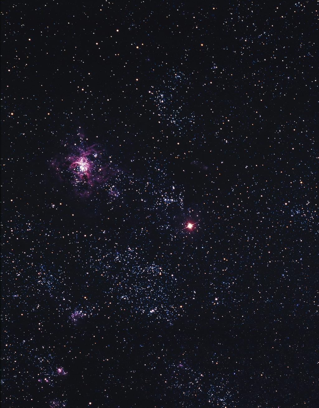 Modern Supernova 1987A: the bright, pointy star near the center. SN 1987A is in a dwarf galaxy the Large Magellanic Cloud that is a satellite of our galaxy. Many of the stars in this picture are foreground stars in our Galaxy. The pink region is the 30 Doradus, a bright emission region gas in the LMC. It's a star formation region. Incidentally this most famous of all modern supernovae was discovered by Ian Shelton, the brother of my UNLV colleague David Shelton.