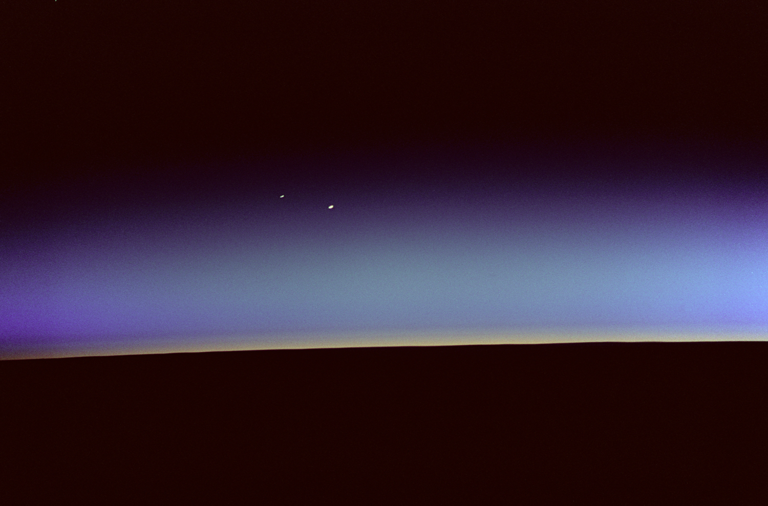 A space shuttle pre-dawn with Venus and Mars. Discovery, 1995aug03.