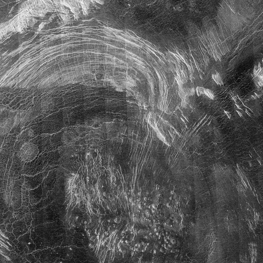 There are also about 360 roughly circular domes or depressions called CORONAS surrounded by circular and radial fractures and located with some volcanos (HI-176).