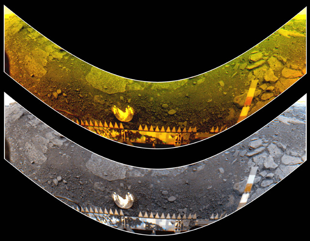 The Venera 13 survived only 2 hr, 7 minutes in the hot, high pressure conditions on Venus. Part of the lander and a camera lens are at the bottom of the picture. Flat rocks and soil are visible. The rock seems to be similar to terrestrial basalt (i.e., dark, denser silicates rich in magnesium and iron probably formed from rapid cooling of lava probably on the surface).